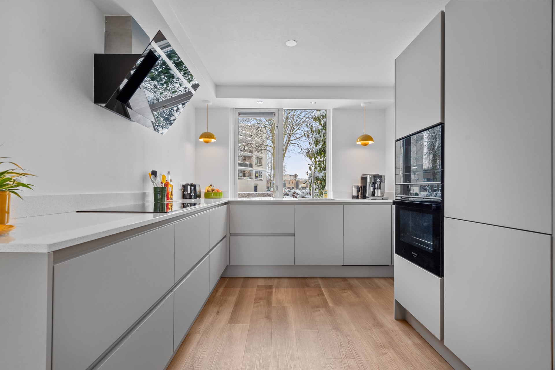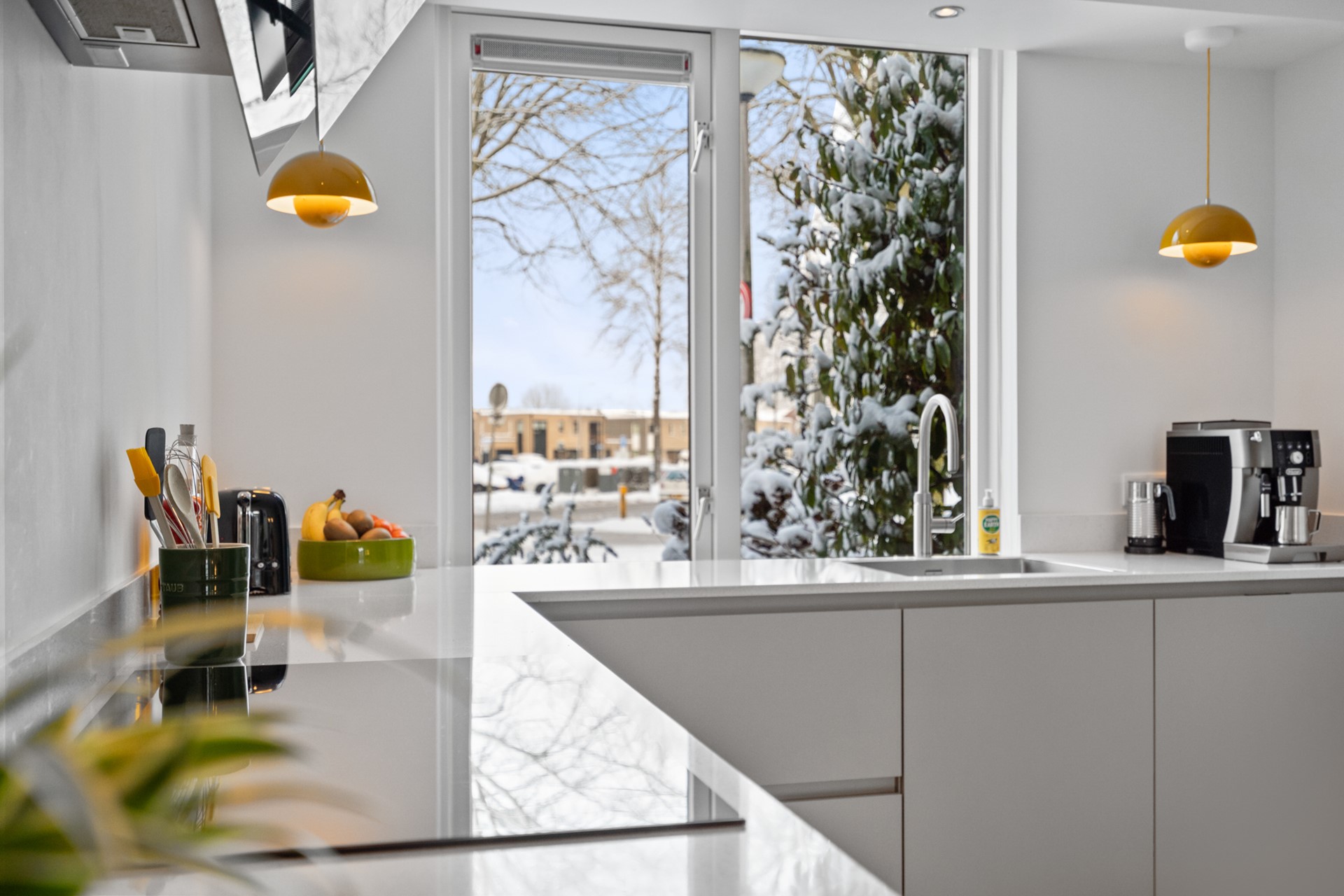 De keuken is een echte blikvanger: gelegen aan de voorzijde, in L-opstelling met extra wandmeubel, en uitgevoerd met hoogwaardige apparatuur zoals een koelkast, vriezer, magnetron, stoomoven, vaatwasser, Quooker, inductiekookplaat en een composiet werkblad. Helemaal van nu en ideaal voor de kookliefhebber.