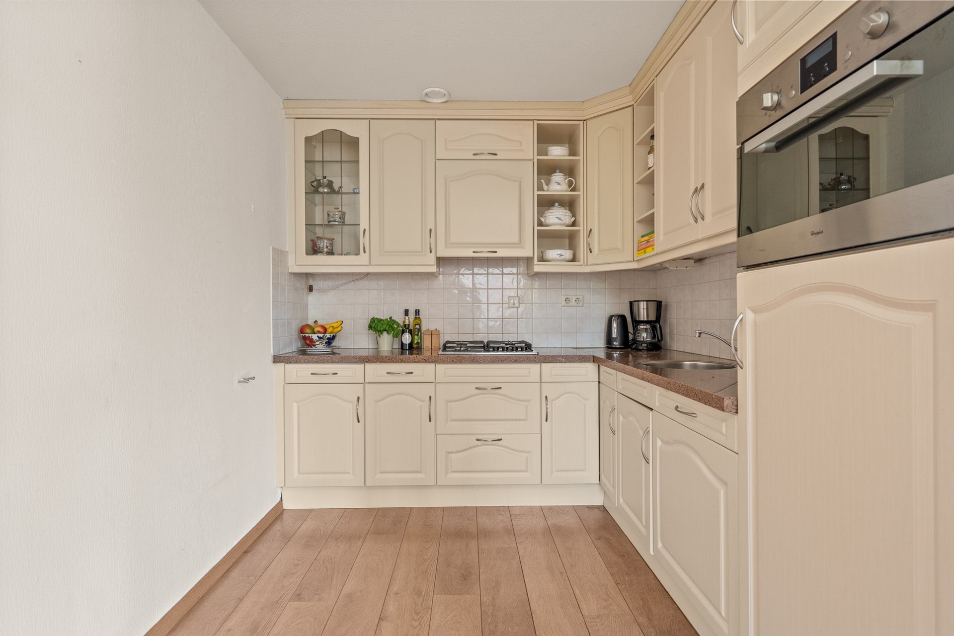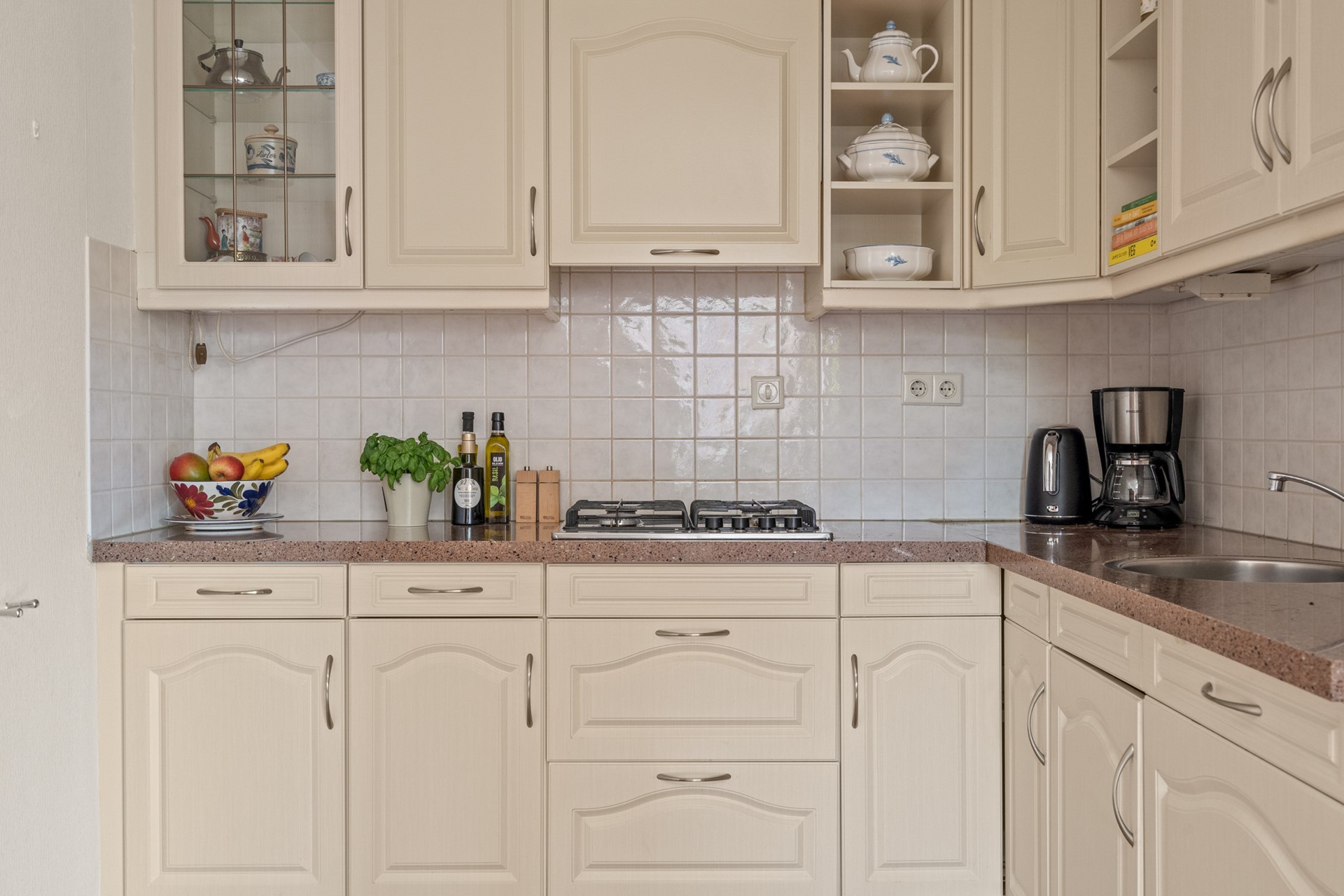 De keuken is voorzien van een 4-pits gasfornuis, koelkast en vaatwasser. Aansluitend is er volop ruimte voor het plaatsen van een royale eettafel, met voldoende bewegingsvrijheid eromheen, waardoor koken en gezellig tafelen moeiteloos in elkaar overlopen.