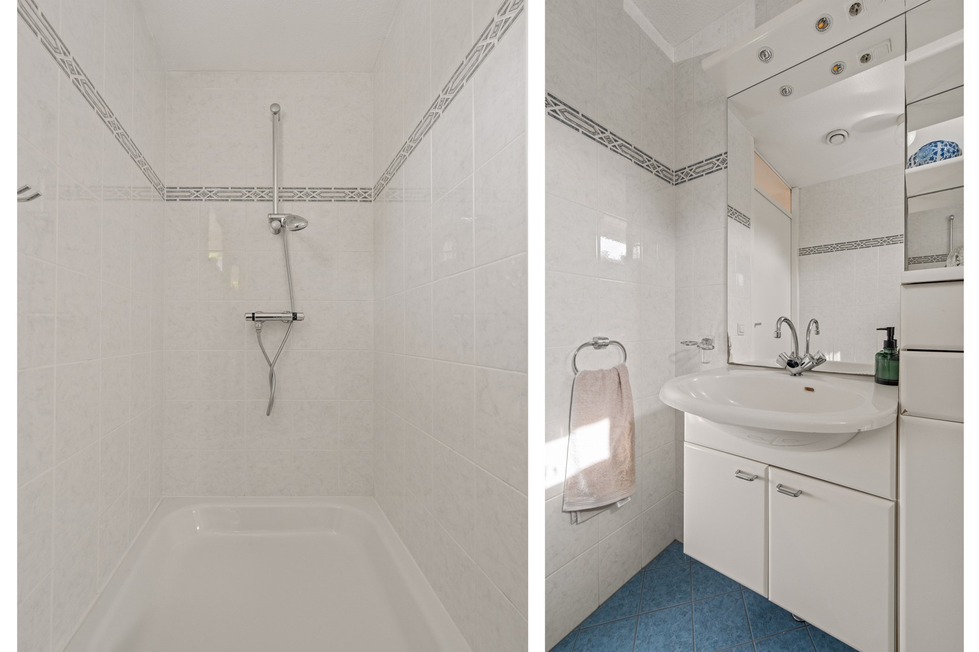 De badkamer is ruim, voorzien van een openslaand raam, praktisch ingericht met een inloopdouche, wastafelmeubel en radiator. Het toilet is separaat en voorzien van een fonteintje.