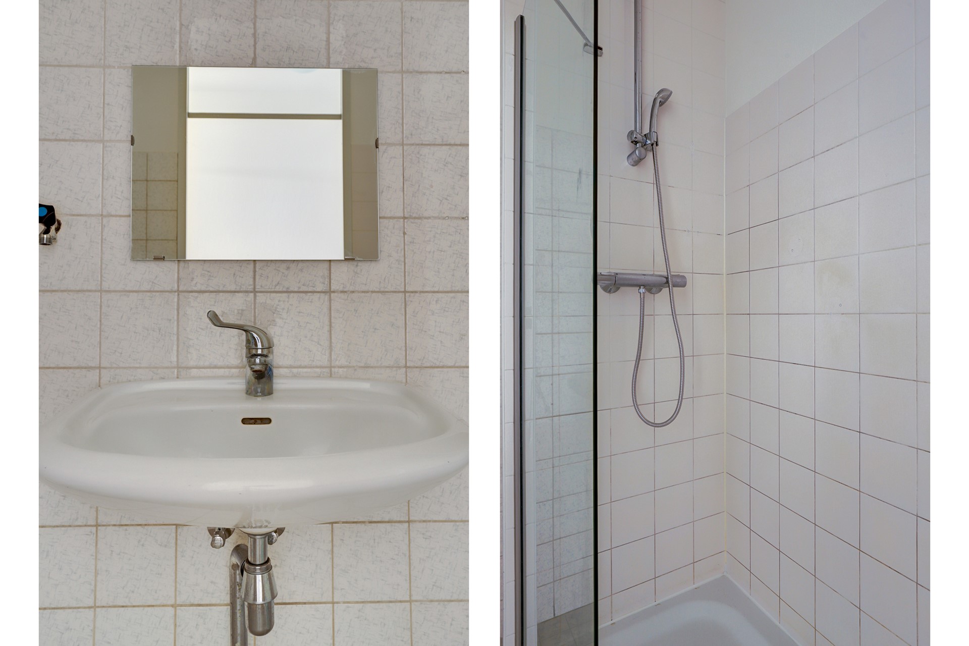 Deze kamer geeft toegang tot het ruime balkon op het zuidoosten. Aan de centrale hal grenzen ook de beide slaapkamers (aan de koele kant van het gebouw) en de badkamer. Die is netjes ingericht met een douche, wasmachineaansluiting en wastafel. Het toilet is separaat. De keuken tenslotte ligt aan de voorkant van het gebouw. Het is fijn om tijdens het koken de schuifpui in de keuken naar het kleine balkon aan de voorkant open te kunnen zetten.