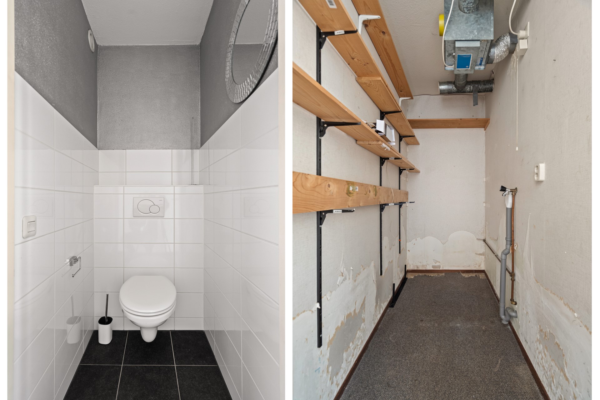 Aan weerszijden van de hal bevinden zich twee slaapkamers van verschillend formaat – ideaal als hoofdslaapkamer en werk- of logeerkamer. De badkamer is netjes gerenoveerd en beschikt over een douche en wastafel. Daarnaast is er een separaat toilet en een inpandige berging met wasmachineaansluiting.