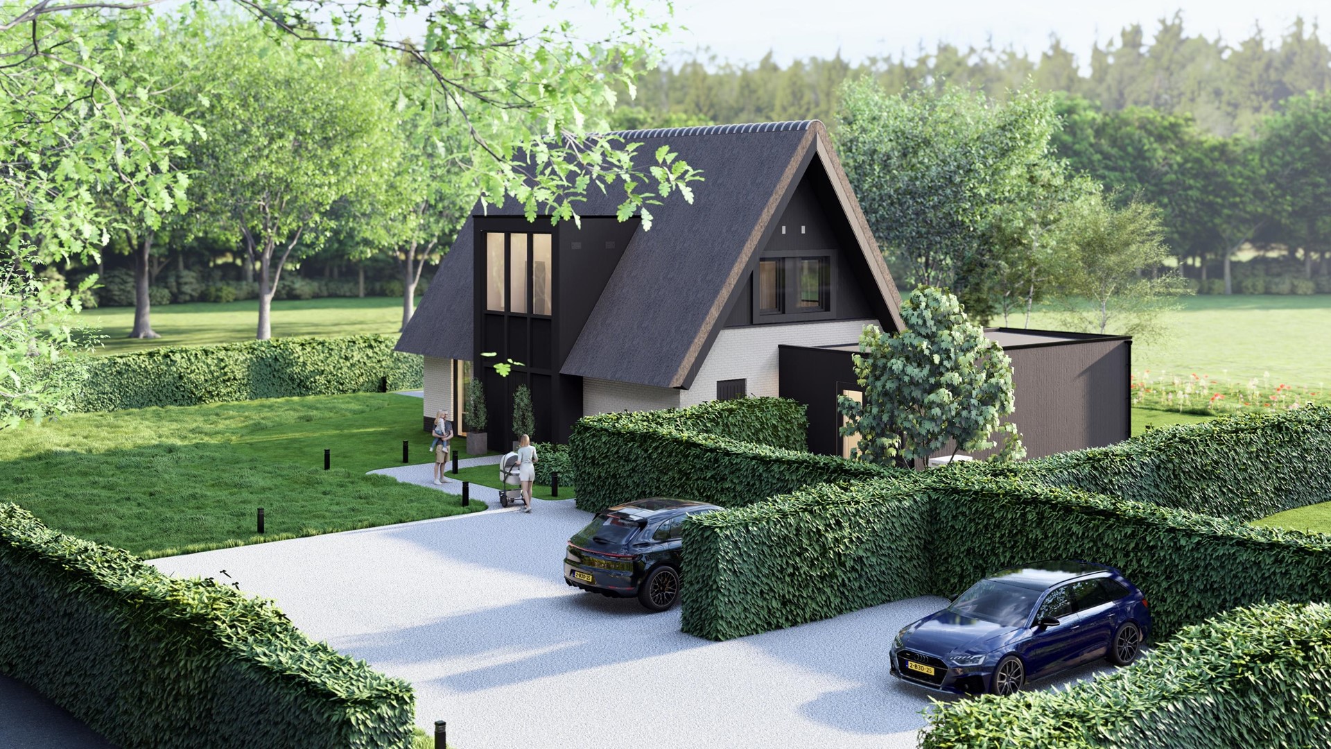 De architectuur dient aan te sluiten bij het erfkarakter, bijvoorbeeld in een eigentijdse schuurwoningstijl met grote raampartijen, een krachtig silhouet en een rieten kap.