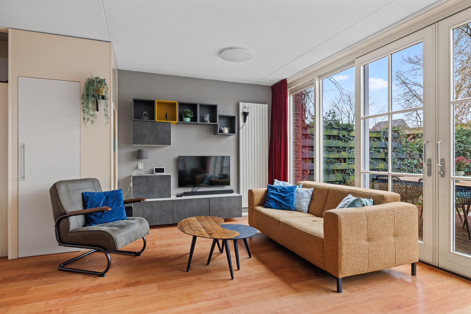 De ruime woonkamer vormt het hart van de woning en biedt volop mogelijkheden voor een comfortabele zithoek en een grote eettafel. Dankzij de schuifpui is er veel lichtinval en een directe verbinding met de zonnige tuin, waardoor binnen en buiten op prettige wijze in elkaar overlopen.