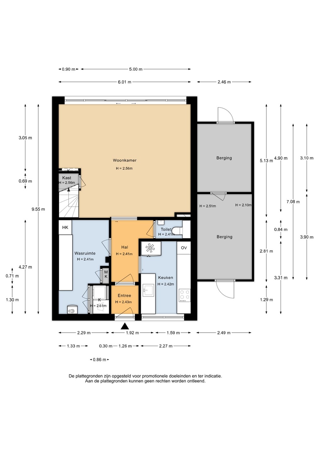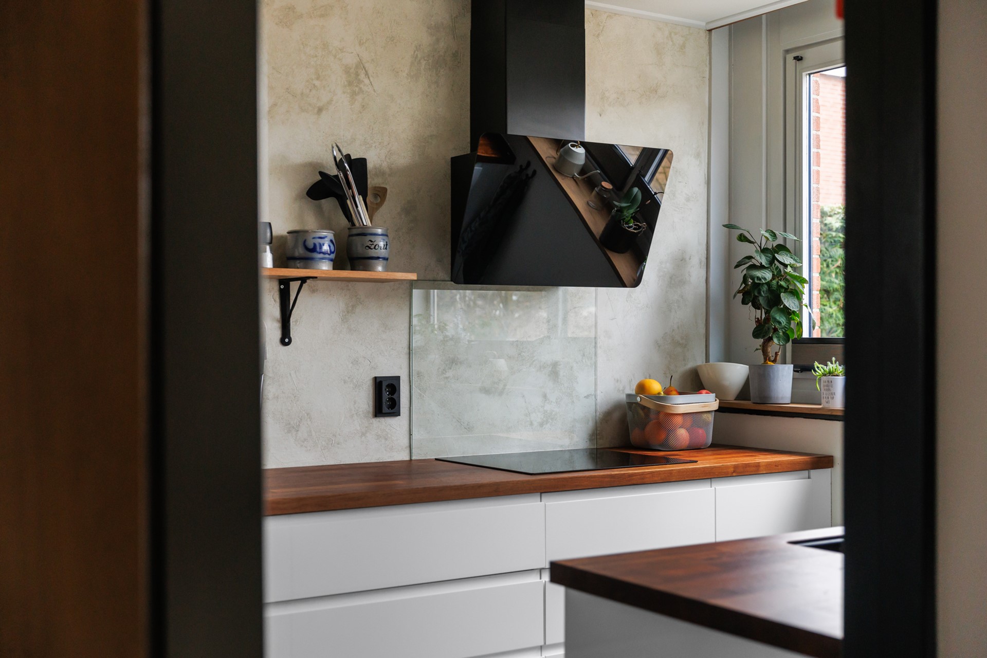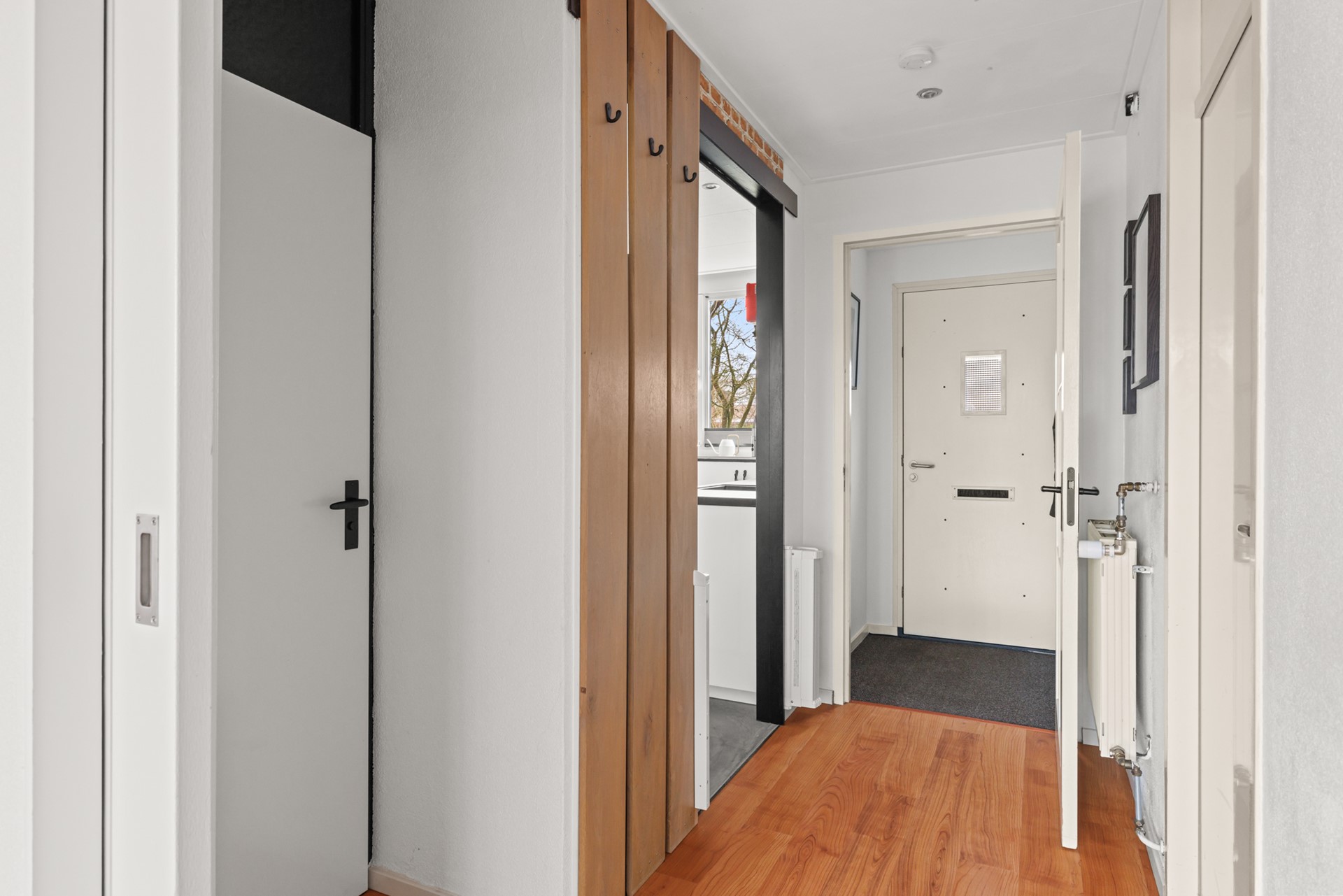 Via het portaal komt u in de hal met toegang tot het toilet. De halfopen keuken is in een dubbele opstelling geplaatst en biedt volop werk- en kastruimte. Aansluitend bevindt zich de bijkeuken met de meterkast en wasmachineaansluiting, ideaal als praktische extra ruimte.