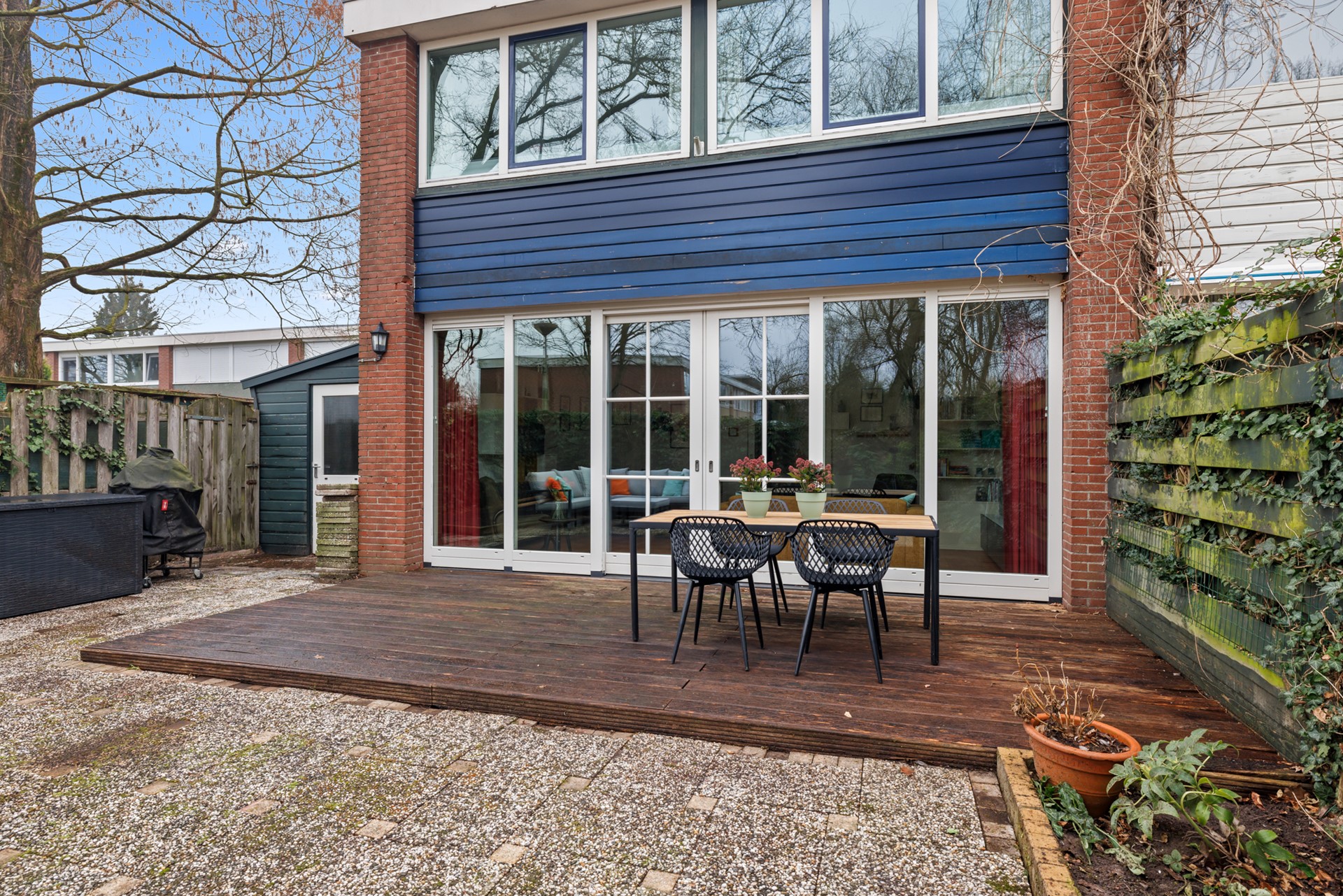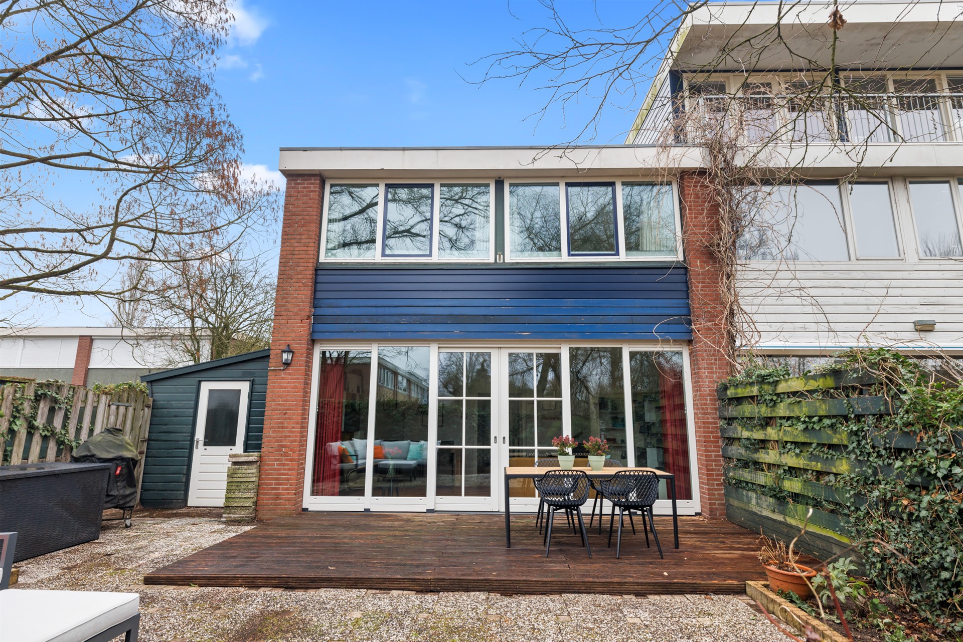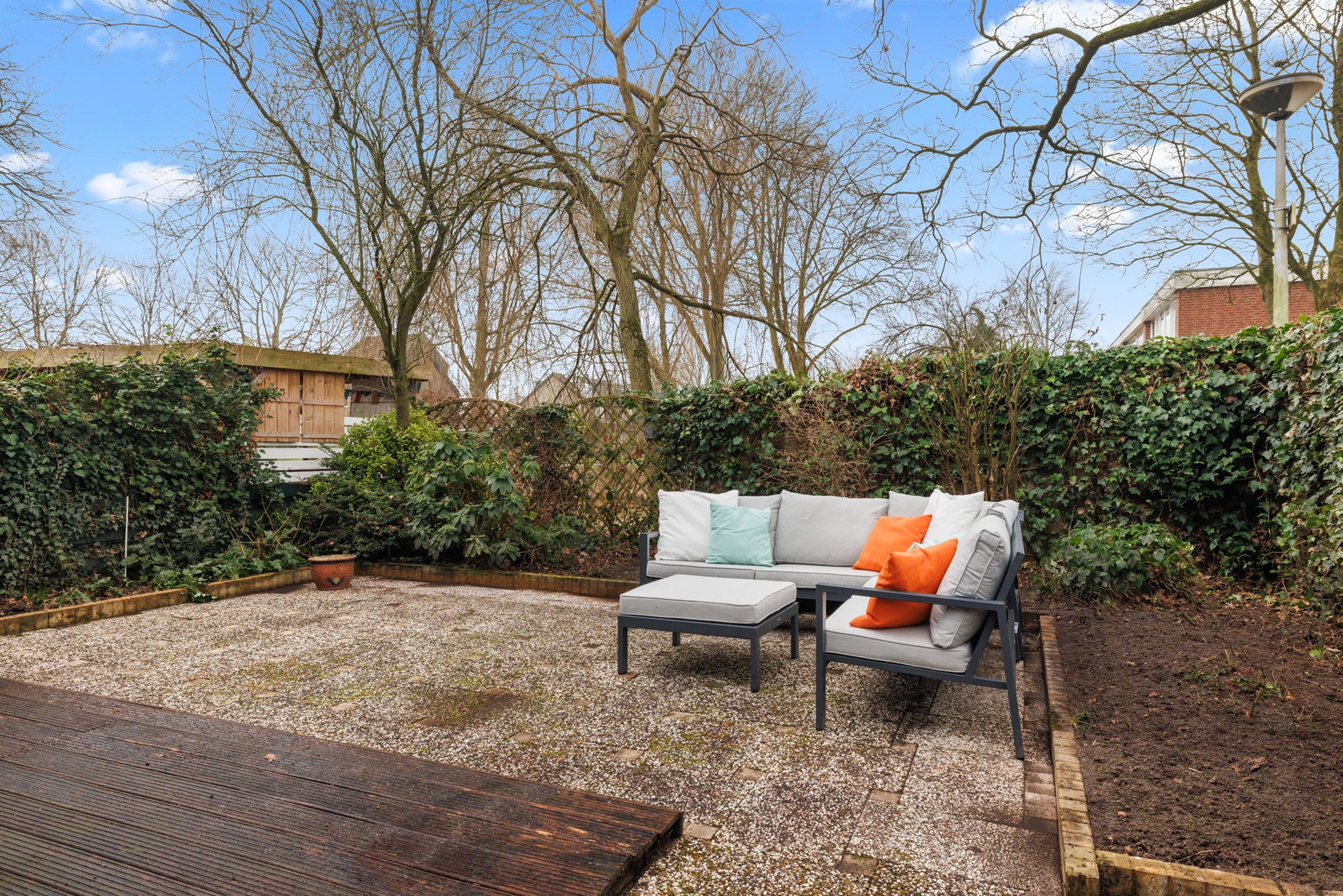 De zonnige achtertuin is gelegen op het zuiden en biedt veel privacy, doordat er geen directe achterburen zijn en de woning grenst aan een groenstrook. Een fijne plek om in alle rust buiten te zitten. Via de zijkant van de woning is er een achterom. Tevens bevindt zich hier een houten berging, ideaal voor fietsen en tuingereedschap.