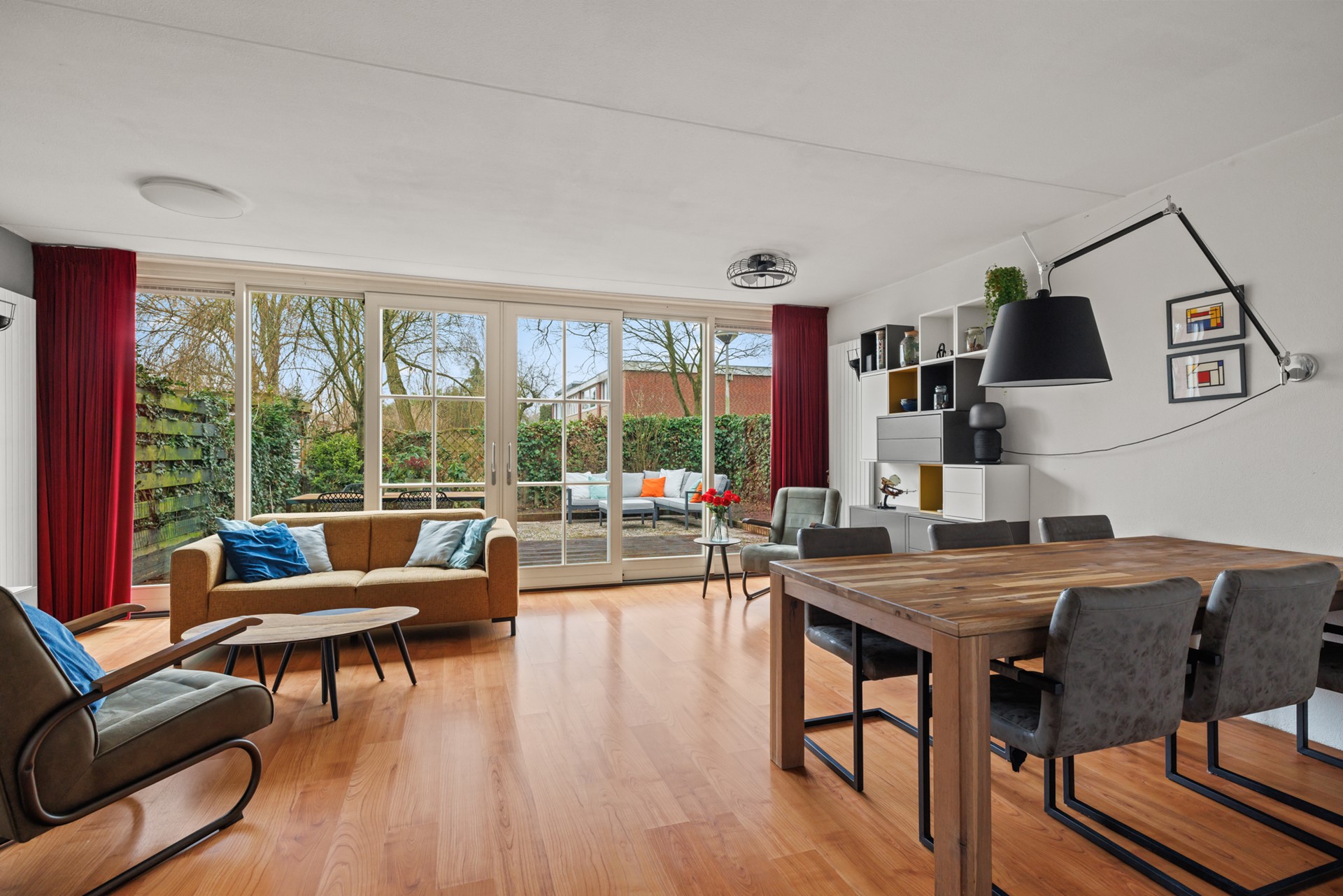 De ruime woonkamer vormt het hart van de woning en biedt volop mogelijkheden voor een comfortabele zithoek en een grote eettafel. Dankzij de schuifpui is er veel lichtinval en een directe verbinding met de zonnige tuin, waardoor binnen en buiten op prettige wijze in elkaar overlopen.