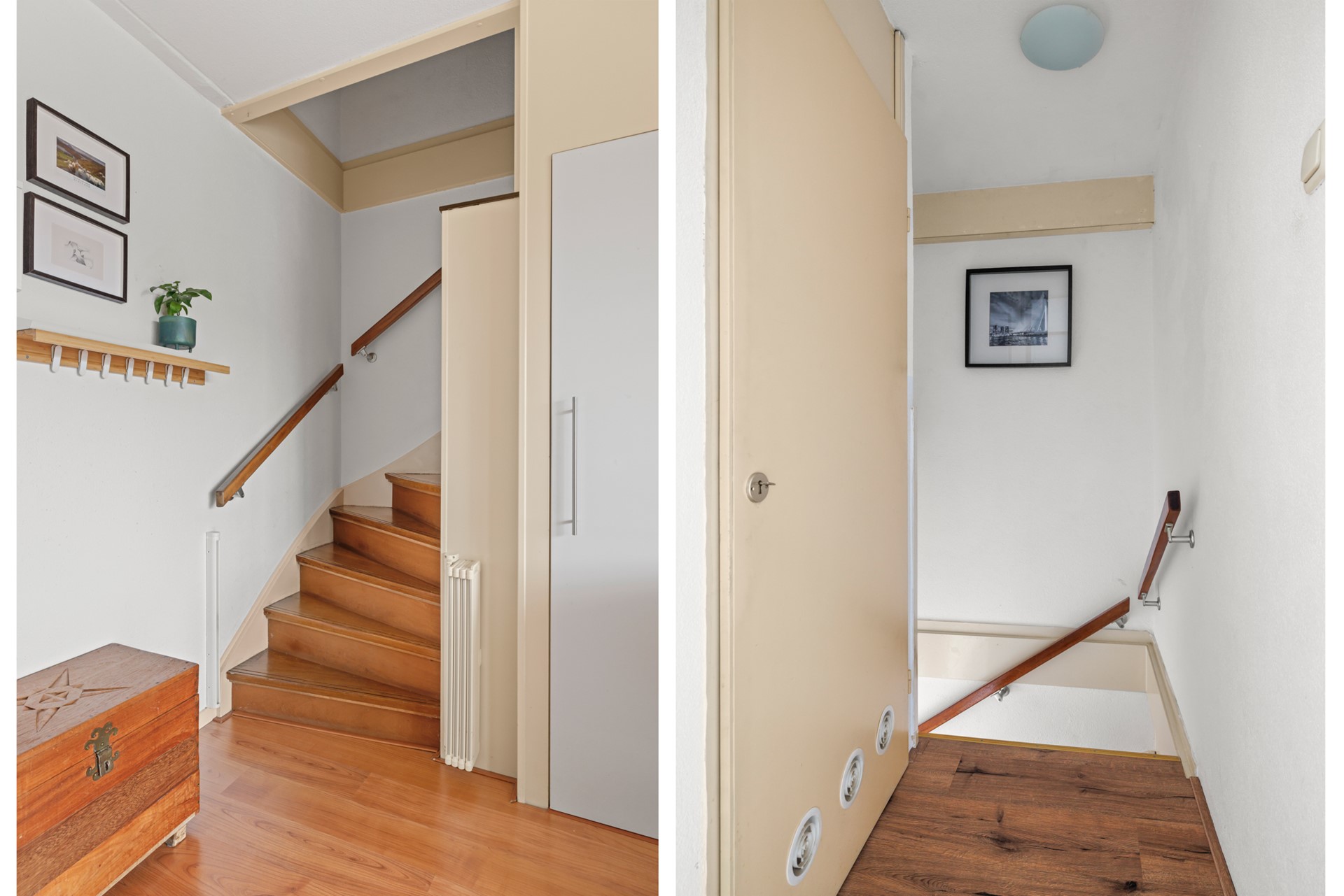 Via het portaal komt u in de hal met toegang tot het toilet. De halfopen keuken is in een dubbele opstelling geplaatst en biedt volop werk- en kastruimte. Aansluitend bevindt zich de bijkeuken met de meterkast en wasmachineaansluiting, ideaal als praktische extra ruimte.