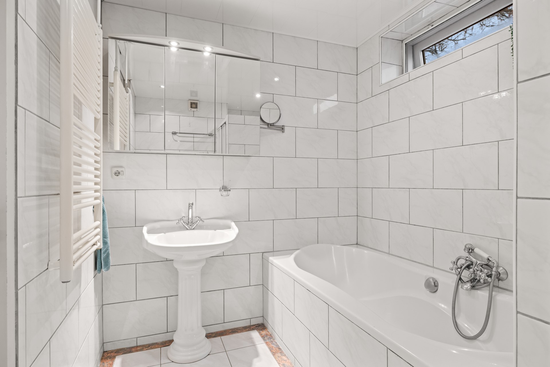 Op de eerste verdieping bevindt zich de overloop met cv-kast. Vanaf hier zijn drie goed bemeten slaapkamers bereikbaar, waarvan één is voorzien van een vaste inbouwkast. De badkamer is compleet uitgevoerd met een wastafel, ligbad, toilet en aparte douchecabine.