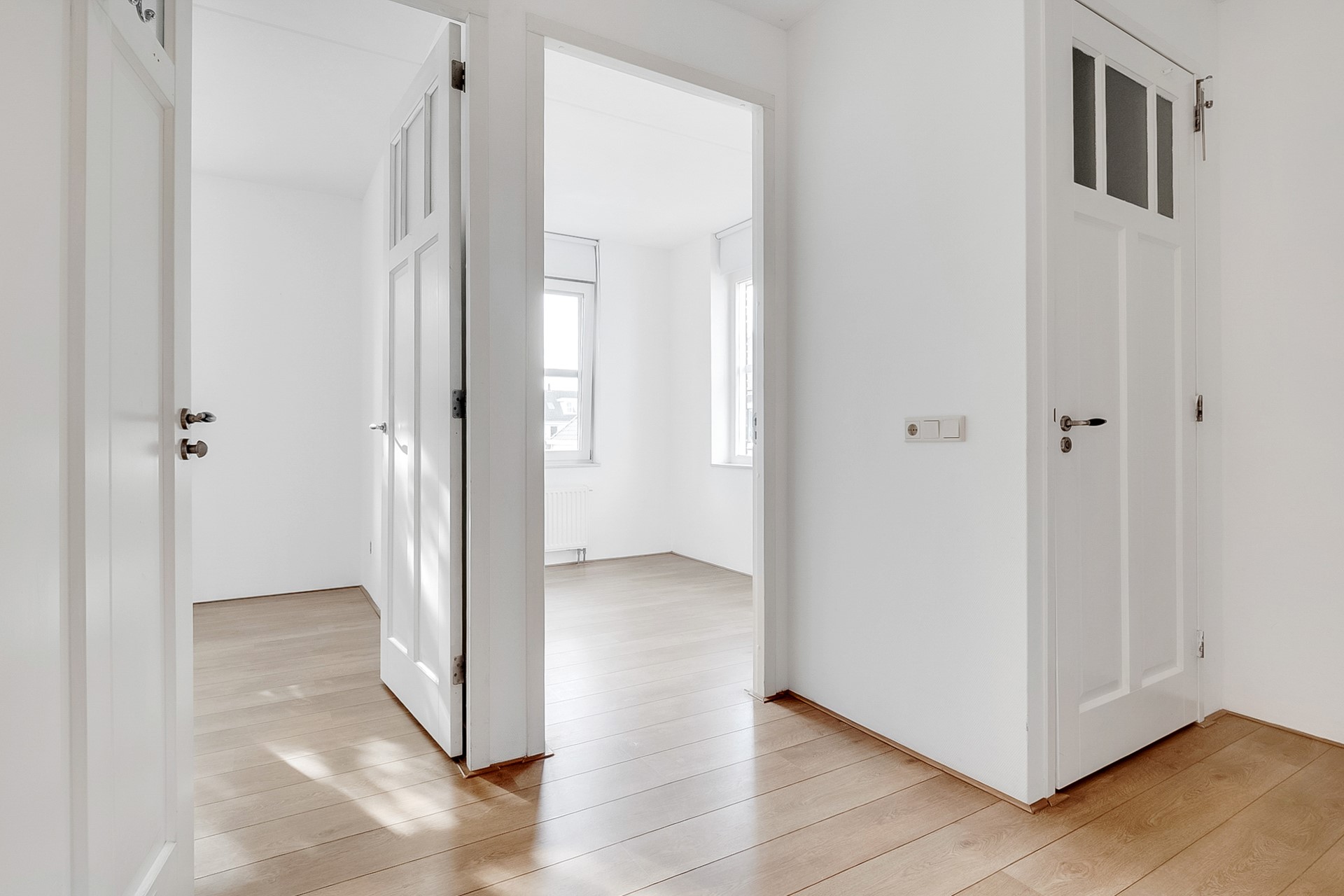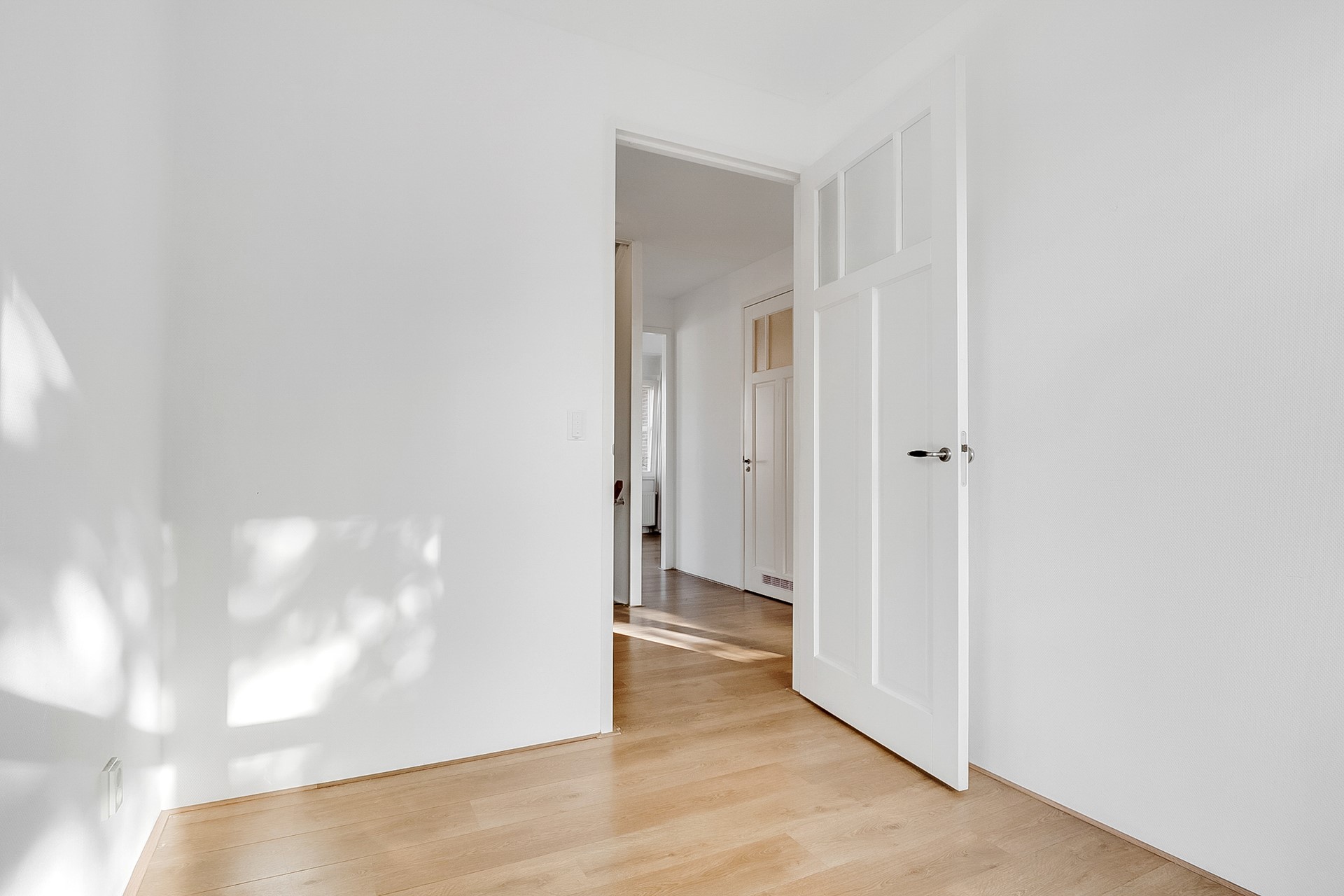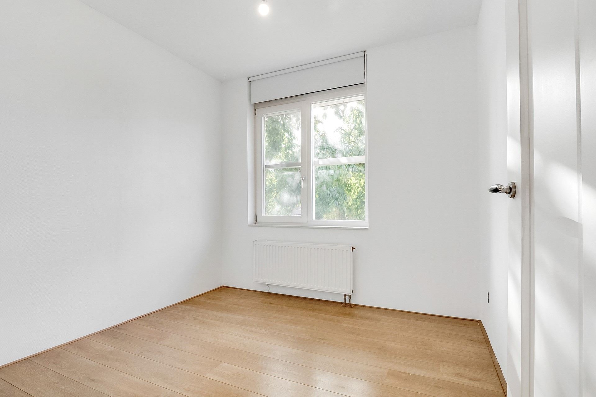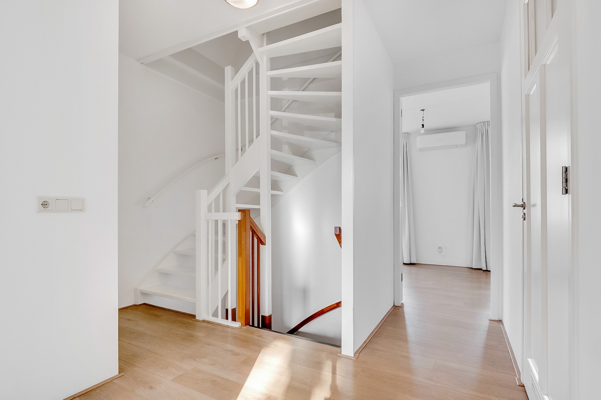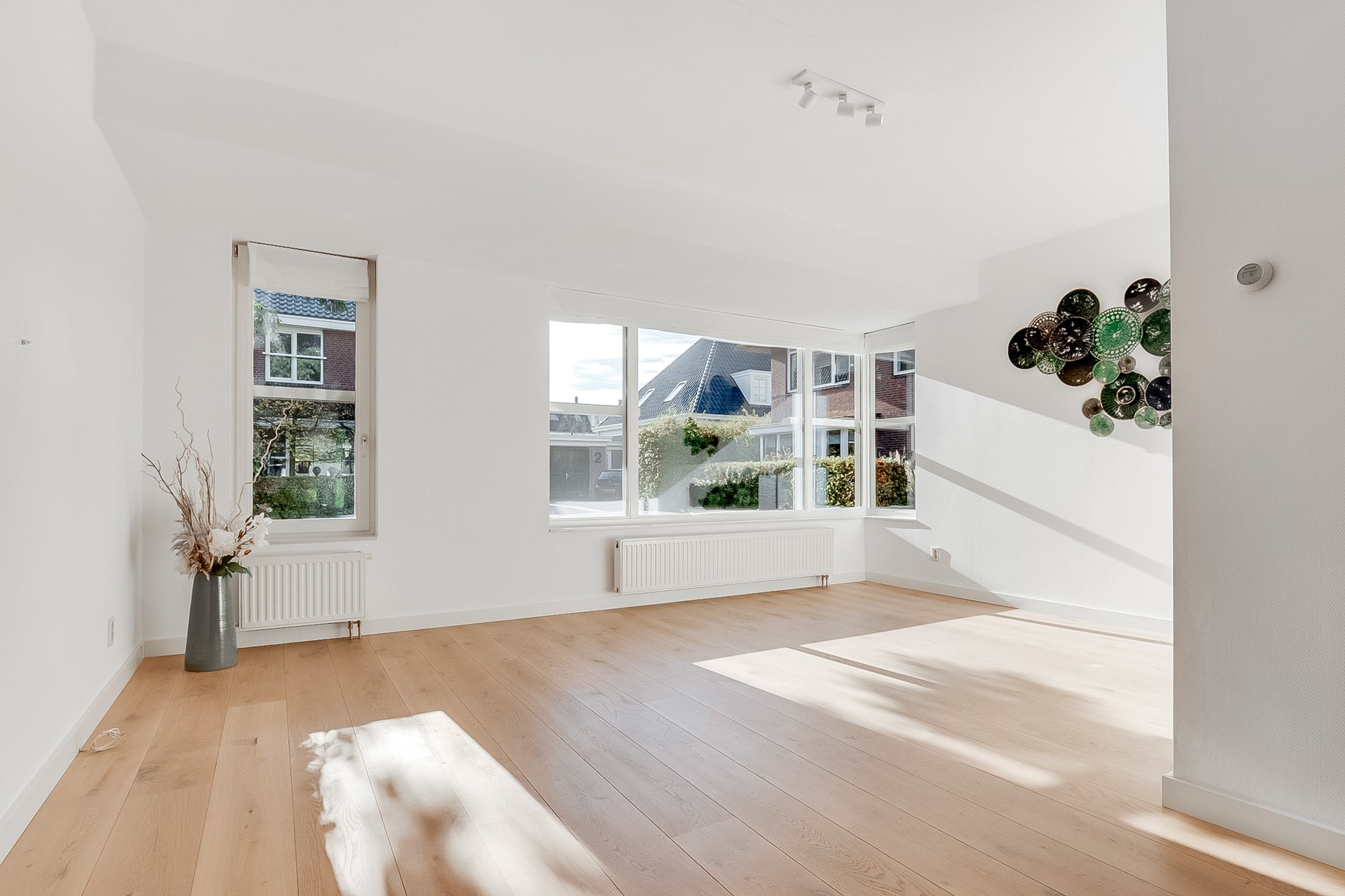Aan de voorzijde ligt een lichte, rustige woonkamer met veel privacy en volop daglicht. De recent gelegde houten vloer geeft het geheel een warme, moderne uitstraling.