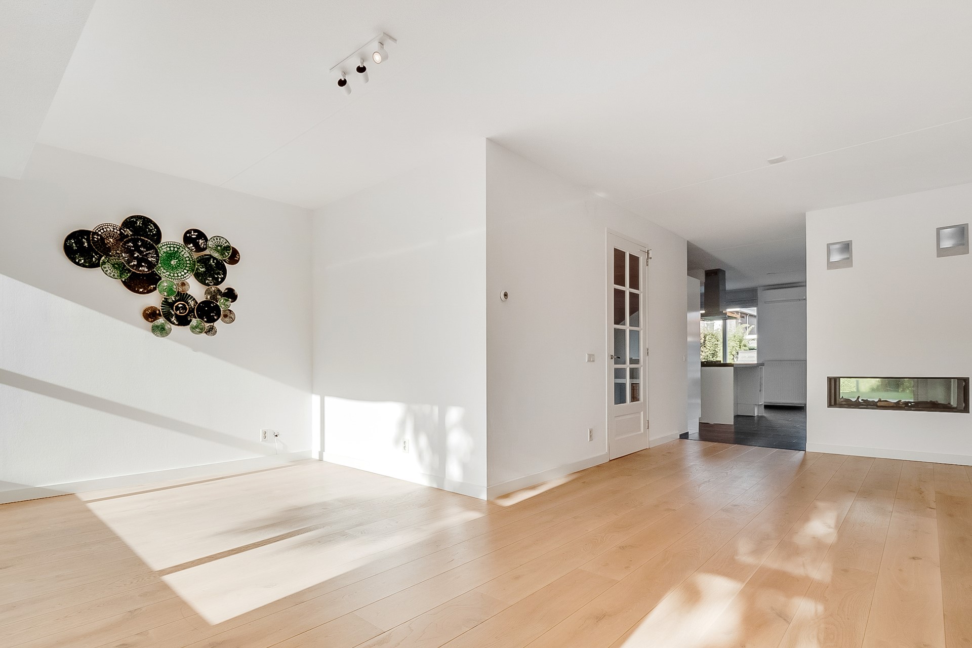 Tussen de woonkamer en de woonkeuken zorgt een stijlvolle gashaard voor extra sfeer en een natuurlijke verbinding tussen de twee leefruimtes.