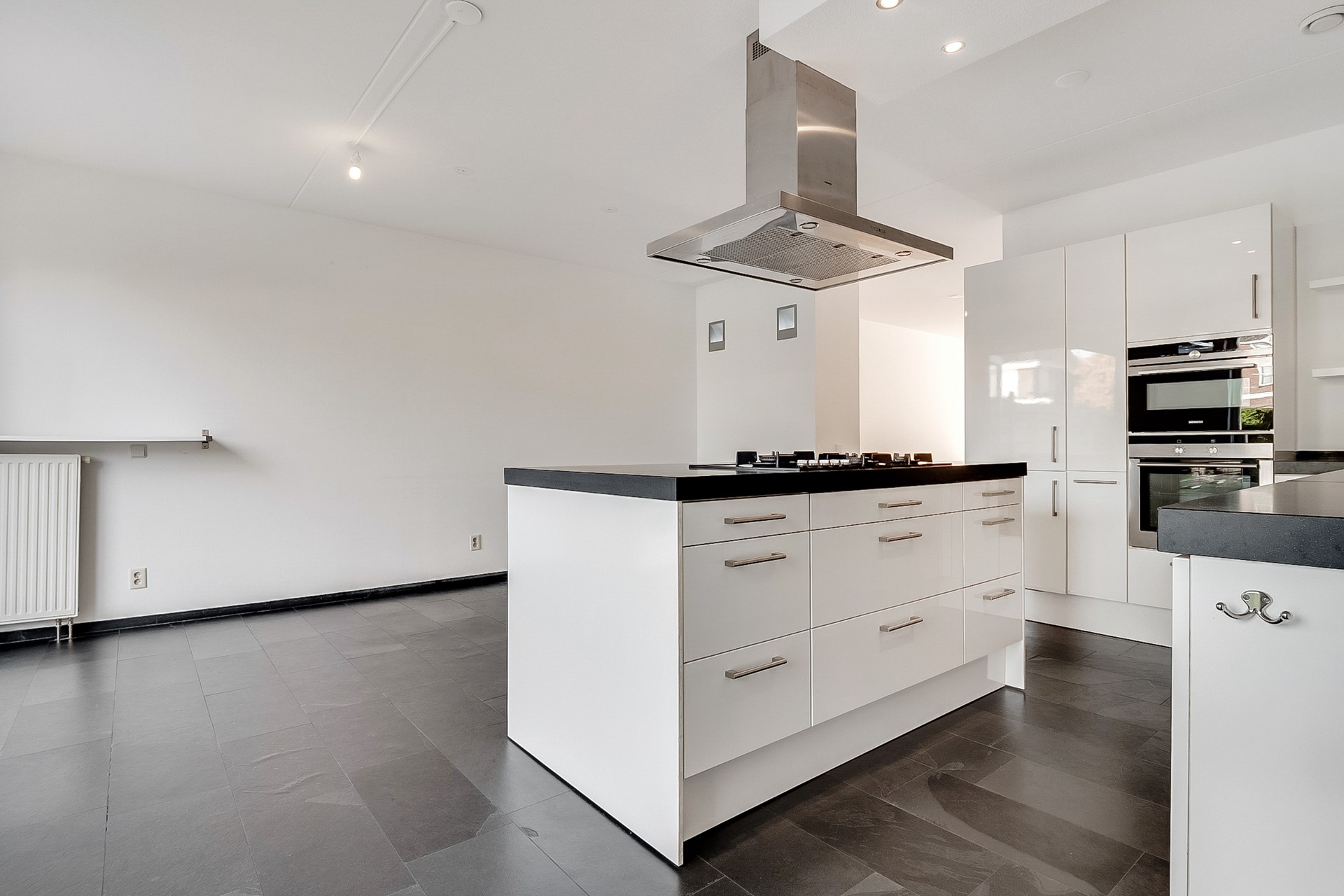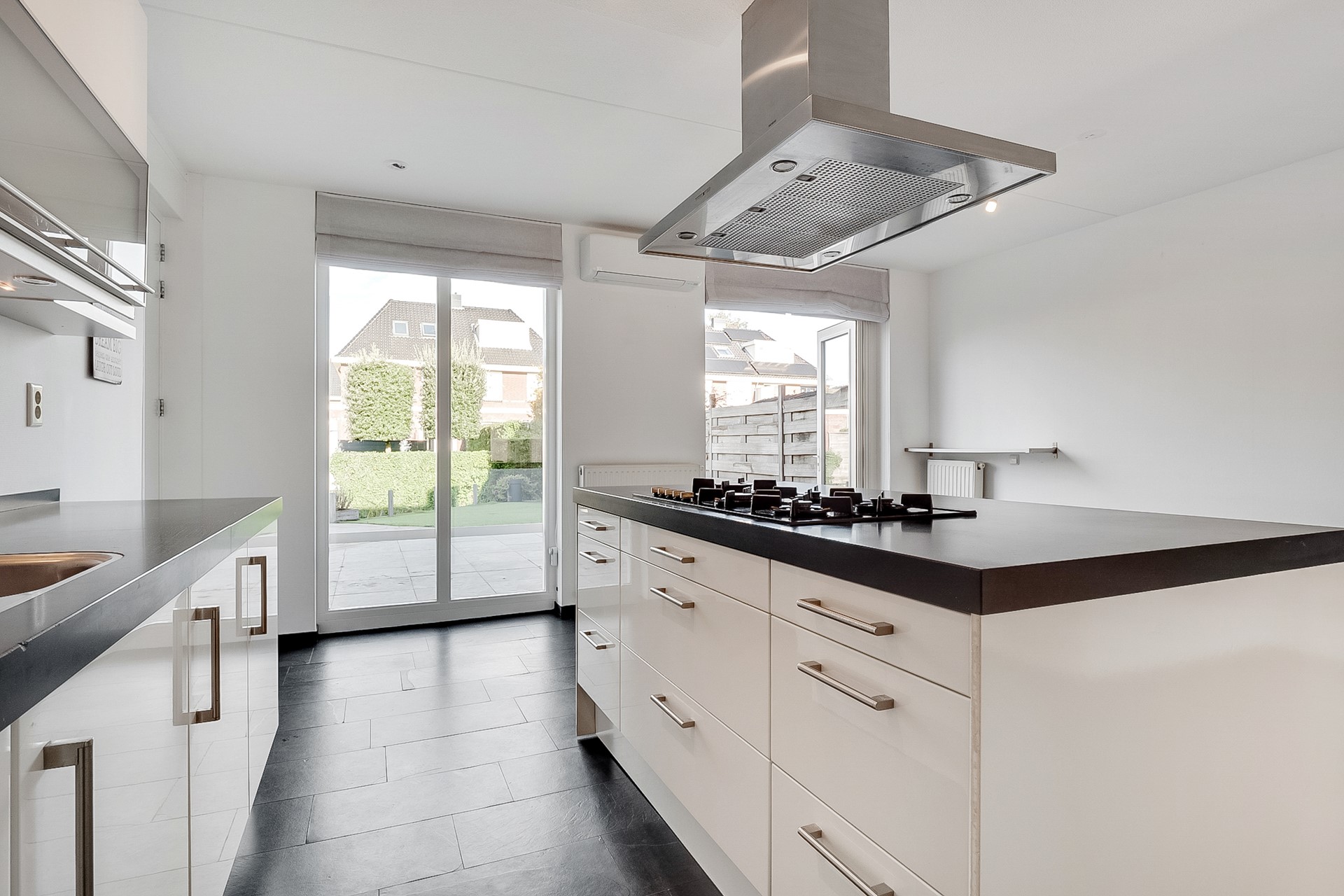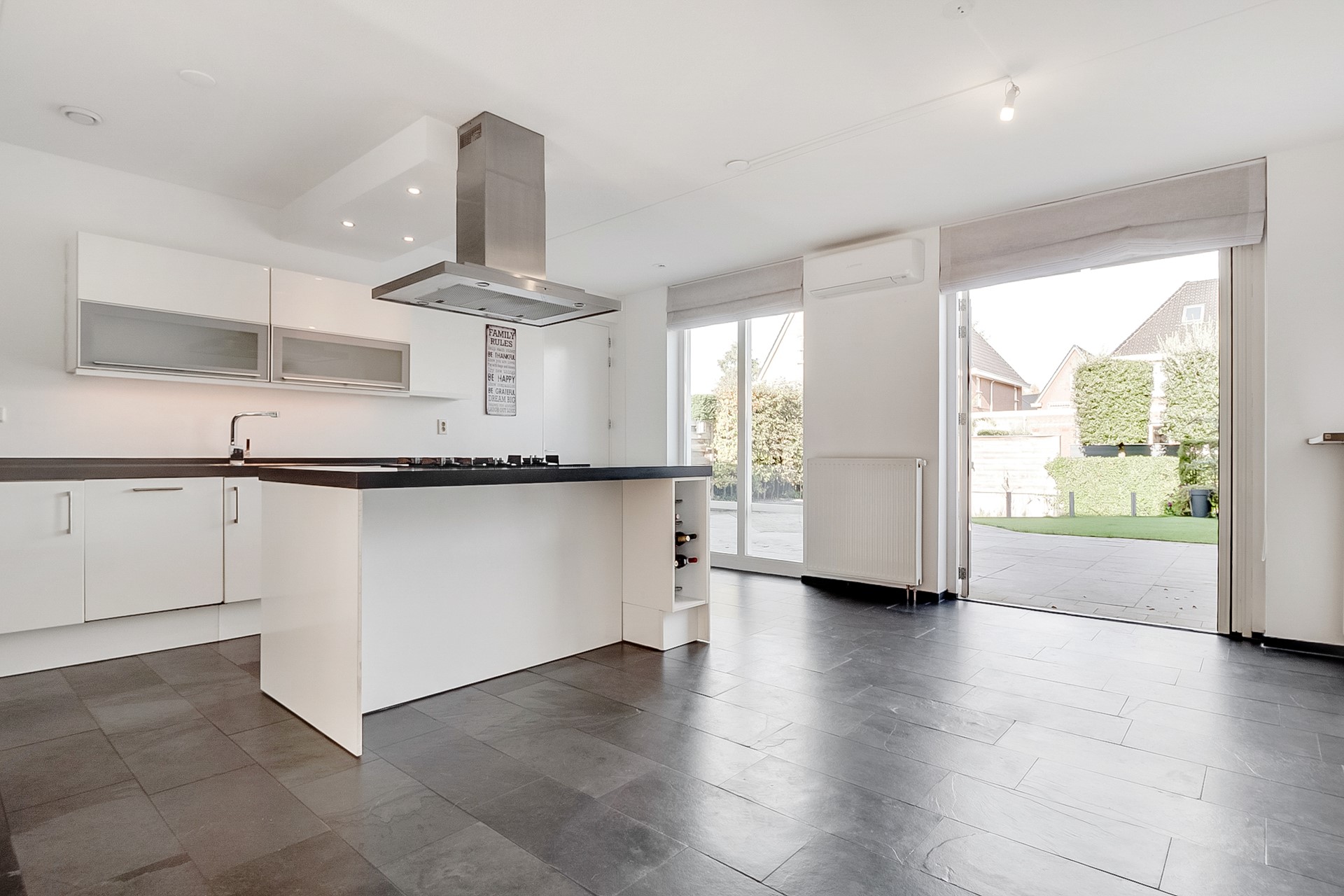 De woonkeuken aan de achterzijde vormt het hart van het huis. Ruim genoeg voor een 8-persoonseettafel, ingericht met een groot kookeiland en een complete wandopstelling met alle gewenste inbouwapparatuur. De leistenen vloer met vloerverwarming zorgt voor extra comfort. Via openslaande deuren stap je direct de tuin in.