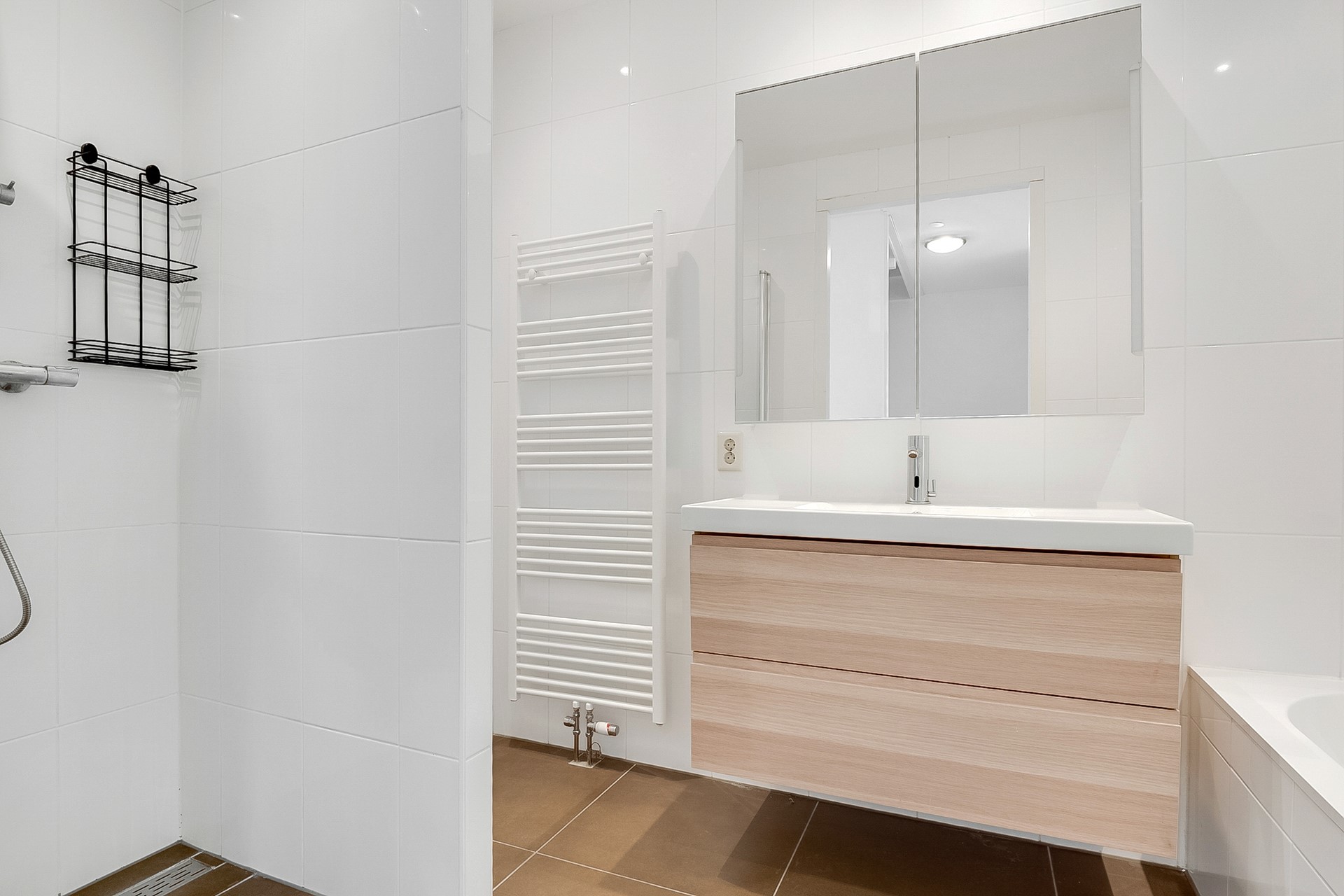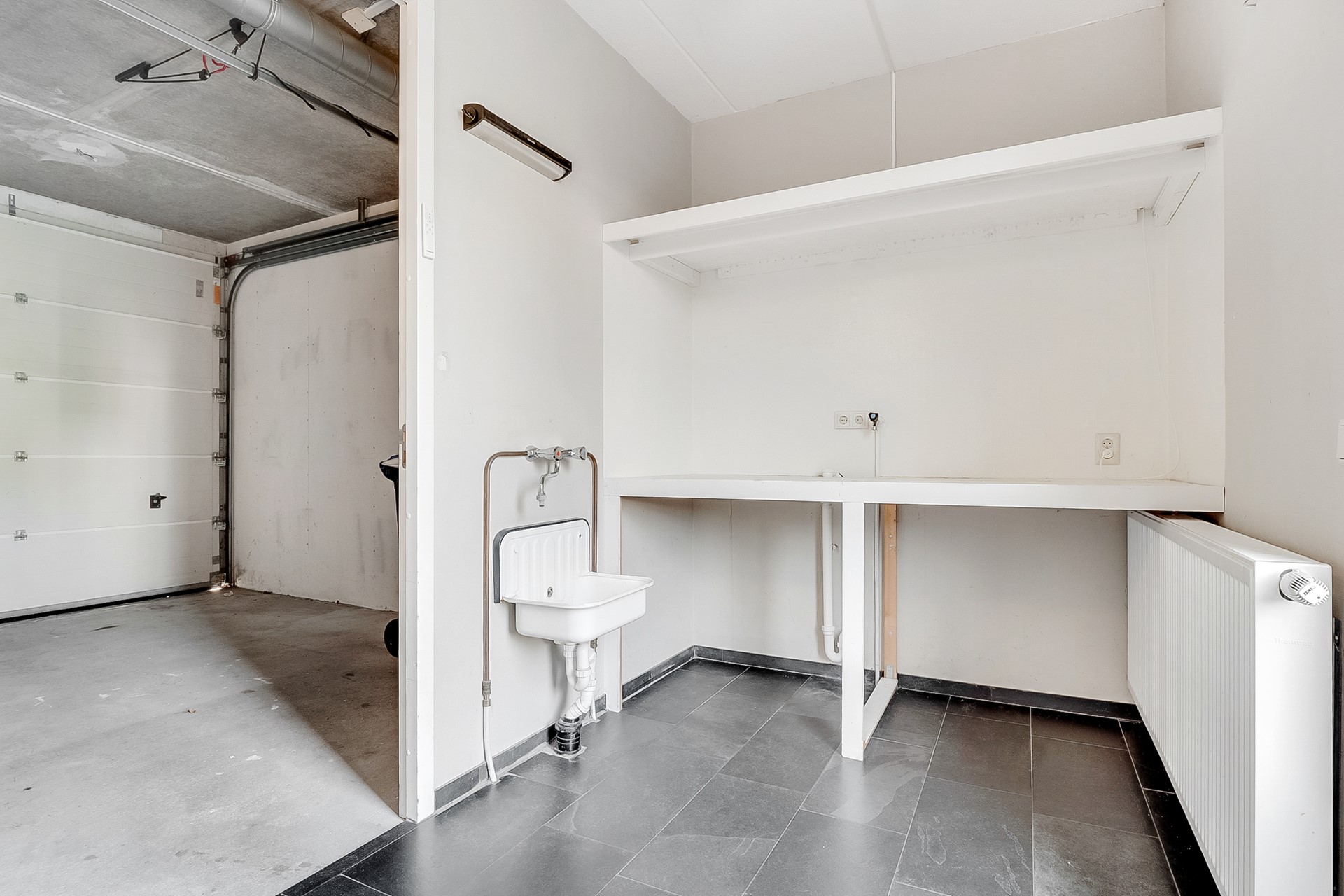 Aangrenzend vind je een praktische bijkeuken met apparatuur op werkhoogte, een deur naar de tuin en een inpandige doorgang naar de berging. Oorspronkelijk vormden deze twee ruimtes samen de garage; ze zijn eenvoudig weer tot één geheel te maken.
