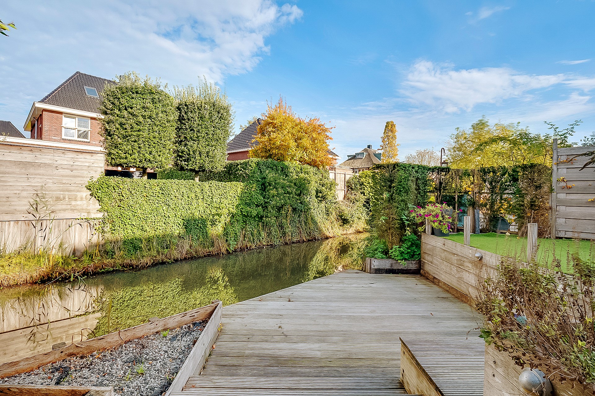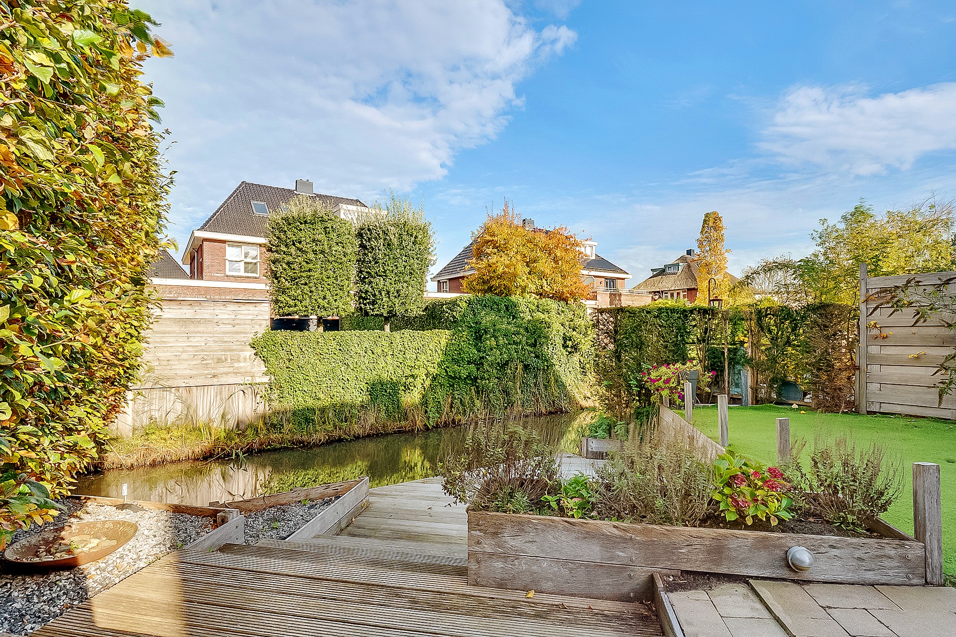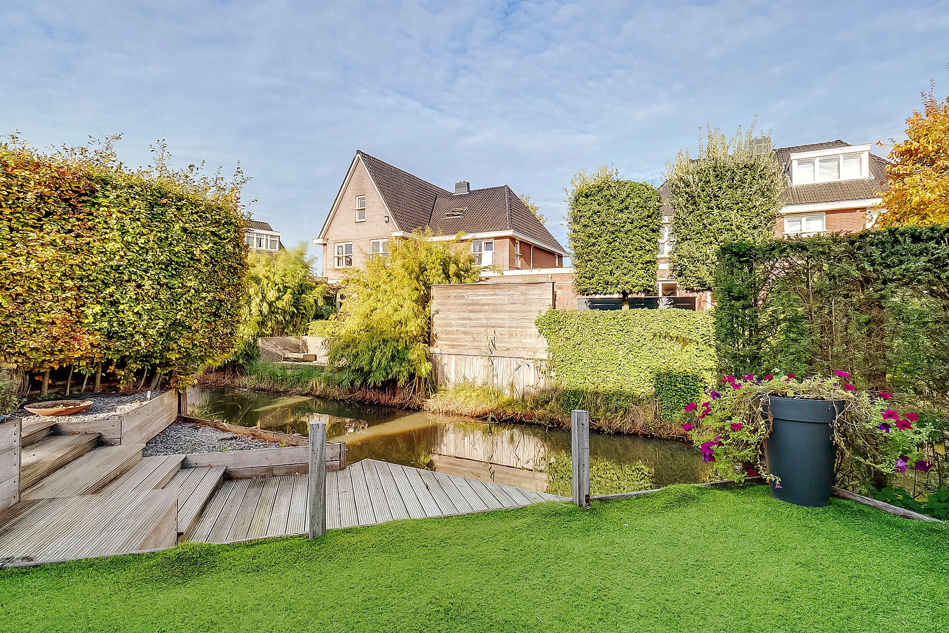 De zonnige, vrij gelegen achtertuin biedt volop privacy en grenst aan het water. Met meerdere terrassen en een verzorgde beplanting geniet je hier het hele jaar door van het buitenleven.