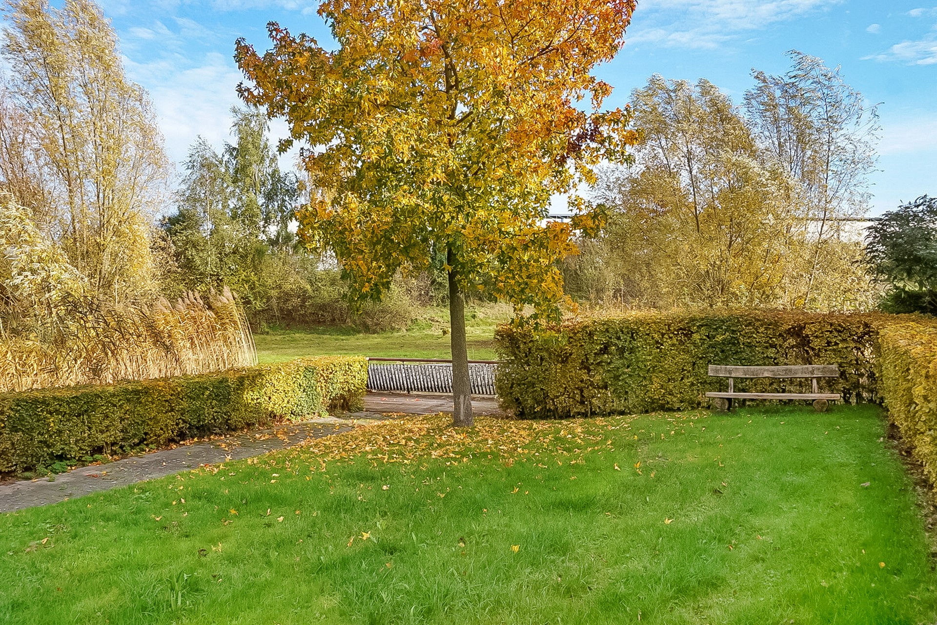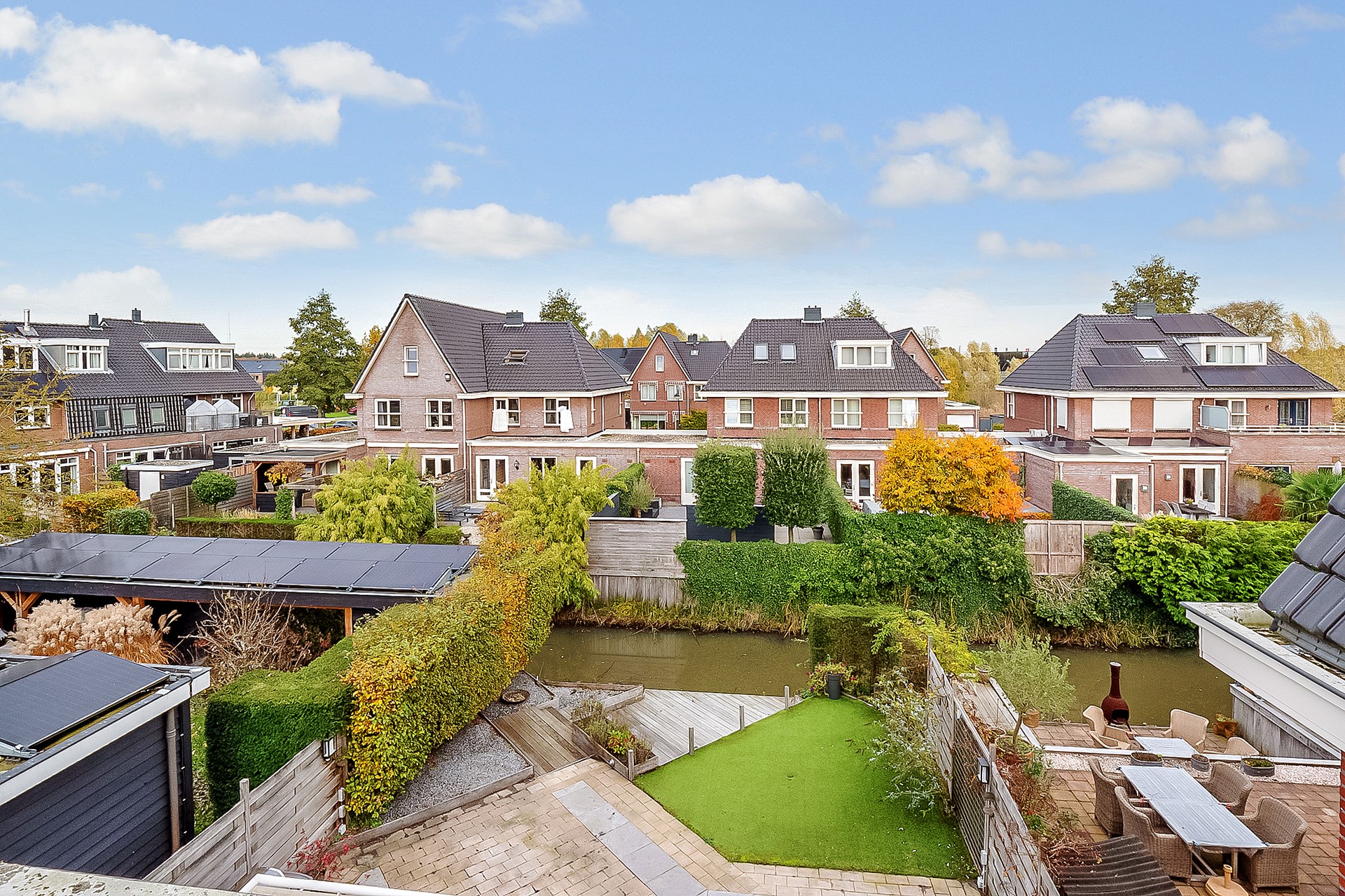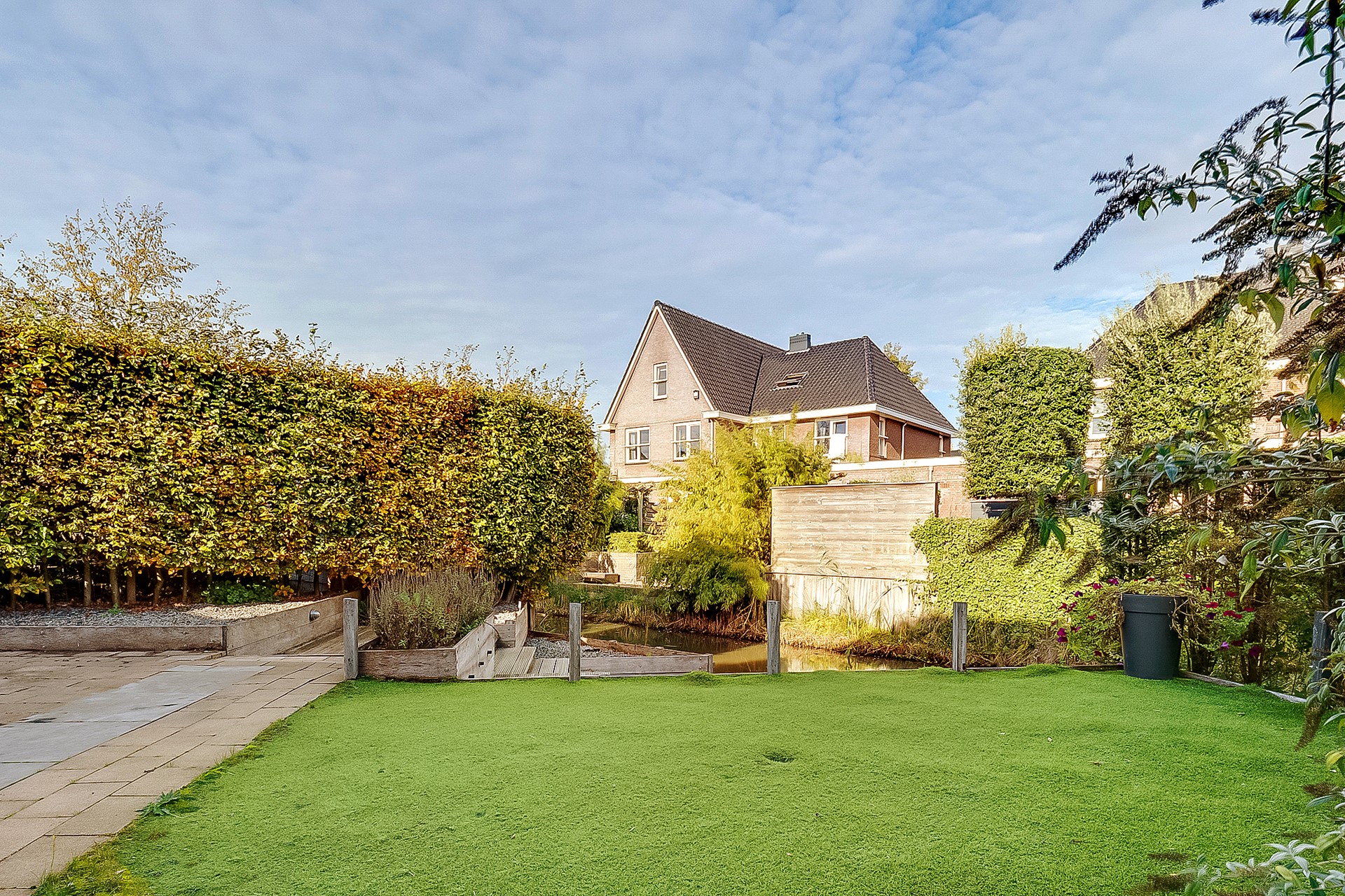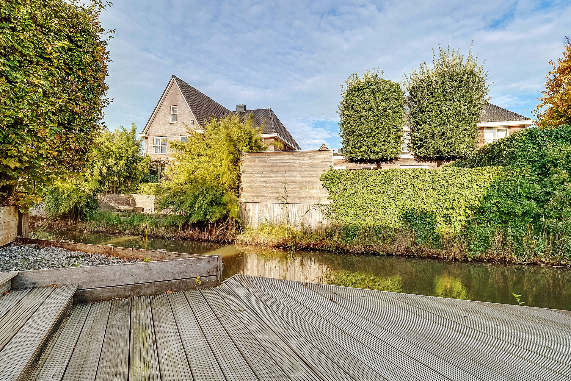 De zonnige, vrij gelegen achtertuin biedt volop privacy en grenst aan het water. Met meerdere terrassen en een verzorgde beplanting geniet je hier het hele jaar door van het buitenleven.