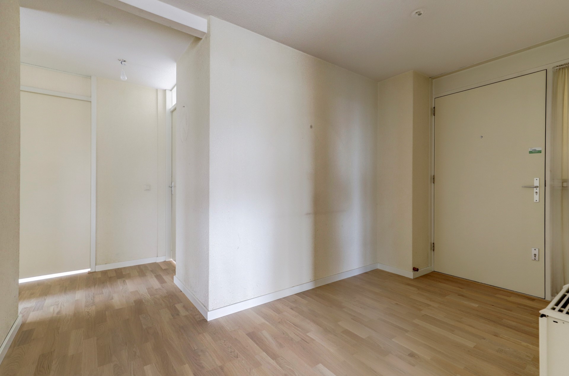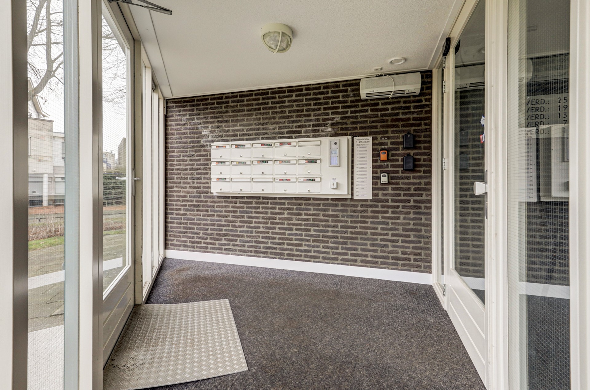 Representatieve centrale entree met brievenbussen, digitaal aanmeldsysteem en afgesloten toegang. Via de lift of het trappenhuis bereik je de vierde verdieping, waar zich de voordeur van het appartement bevindt.